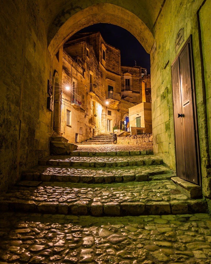 A visit to Matera, the beautiful “Shame of Italy” in the southern region of Basilicata, is an unbelievable experience. It gives you an opportunity to see what it was like to live in caves that were dug into the side of a mountain. Life with no electricity or running water, when farm animals lived in the same quarters as their masters as a way of staying warm in the winter. Then – you get to return to a spectacularly stunning setting with all of the luxuries of the modern world. And when I say spectacularly stunning, I mean it is fit to serve as a movie set and in fact, it has been the set for several movies including – “The Passion of the Christ” and James Bond “No Time to Die”.